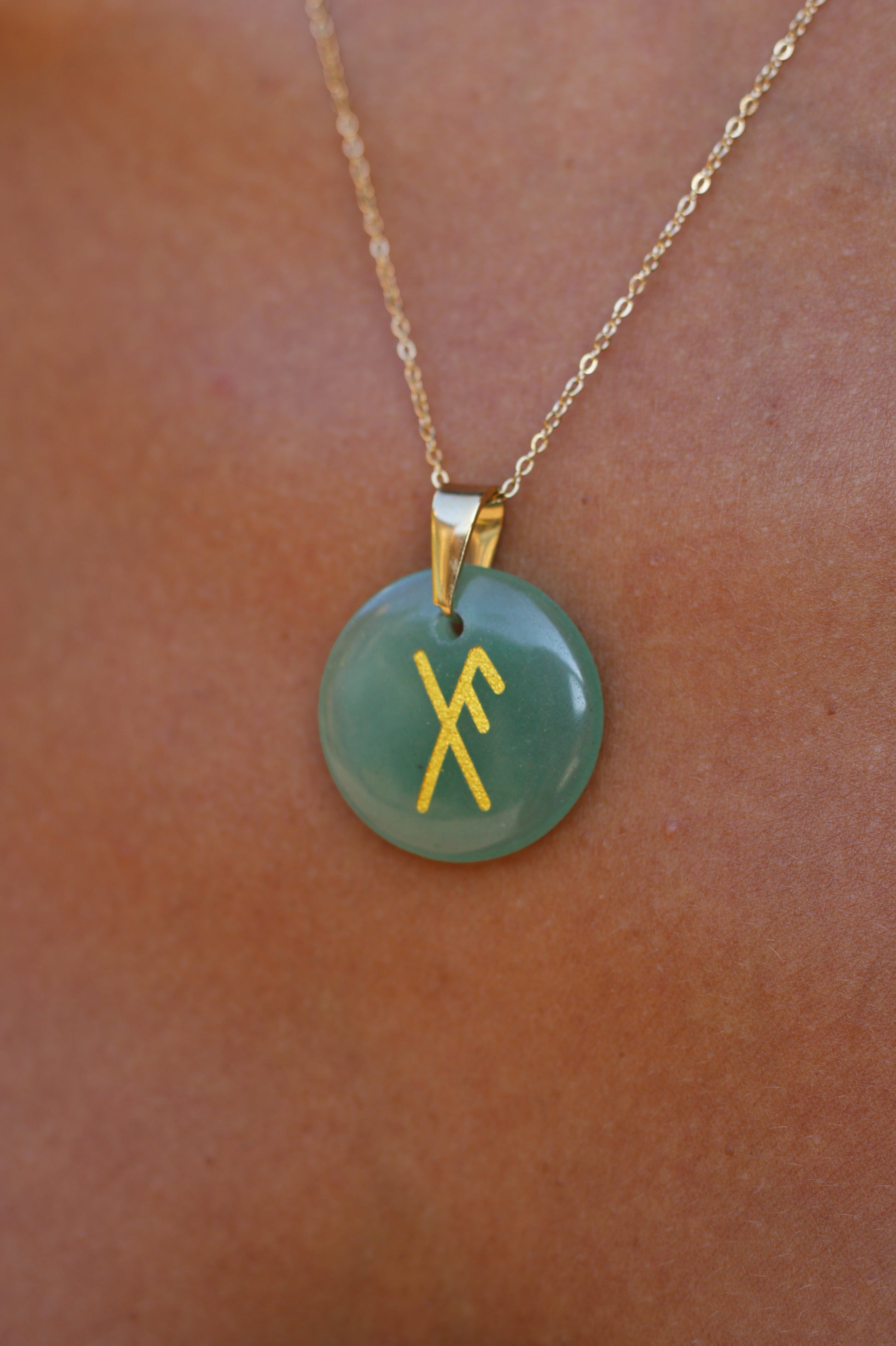 Collier composé d'un pendentif en pierre naturelle d'Aventurine verte gravé de la rune liée Chance✨ et d'une chaine en acier inoxydable. La combinaison des runes nordiques ancestrales Gebo (don) et Ansuz (bonne fortune) représente la rune liée Don de Chance. L'aventurine verte, pierre de chance et d'apaisement permet de renforcer les effets de ce talisman à porter sur soi pour bénéficier de ses vertus. Aventurine verte origine Brésil.